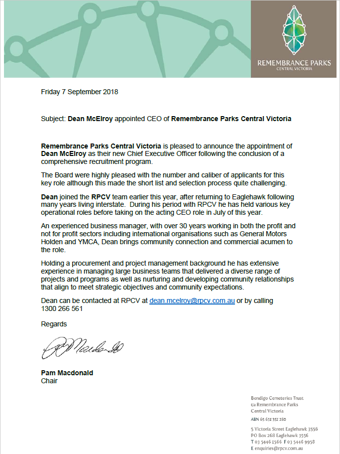 Dean McElroy appointed CEO of Remembrance Parks Central Victoria admin2022-11-28T05:24:38+00:00 Share This Story, Choose Your Platform! FacebookXRedditLinkedInWhatsAppTelegramTumblrPinterestVkXingEmail Related Posts All sites now open All sites now open Impacts of continued and prolonged rain Impacts of continued and prolonged rain Current Status of Our Sites – Updated 31/10/2022 Current Status of Our Sites – Updated 31/10/2022 Symons Lawn Temporarily Closed Symons Lawn Temporarily Closed