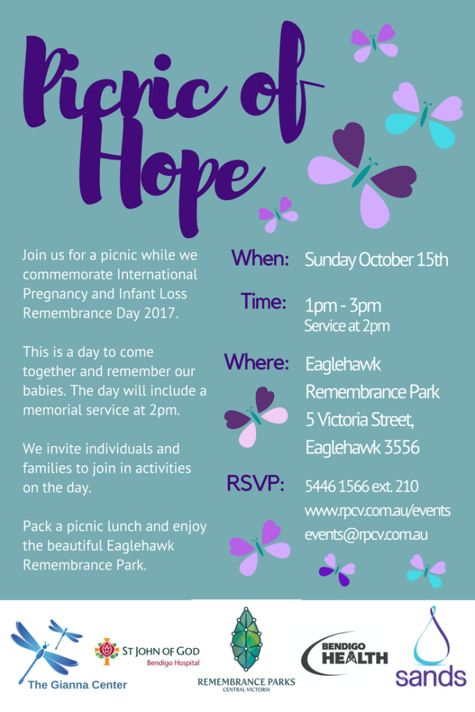 This is a day to come together and remember our babies. The day will include a memorial service at 2pm. A partnership with St John of God Hospital, The Gianna Centre, Bendigo Health and RPCV.