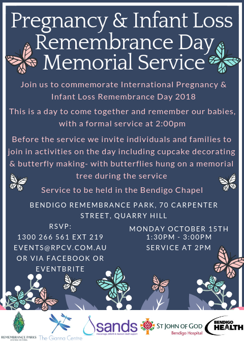Join us to commemorate International Pregnancy & Infant Loss Remembrance Day 2018. This is a day to come together & remember our babies, with a formal service held at 2:00pm.